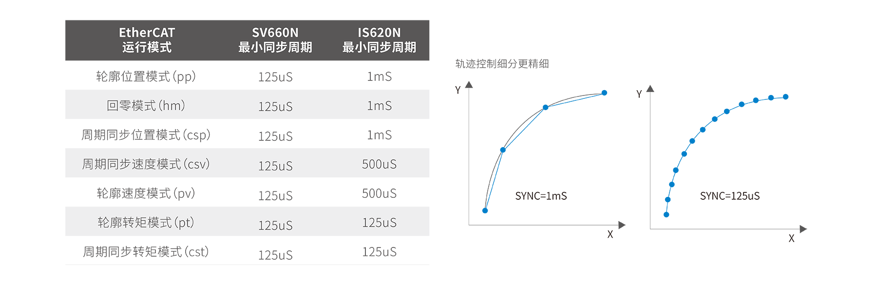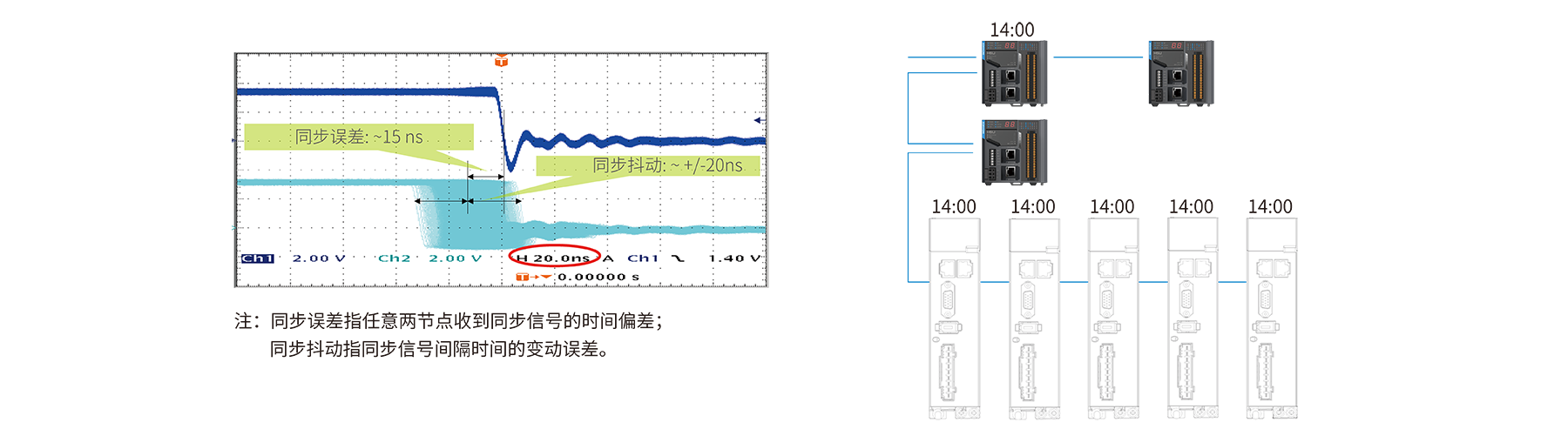 EtherCAT通訊同步周期可支持125uS可實(shí)現300個(gè)節點(diǎn)120m距離,15ns同步誤差、±20ns同步抖動(dòng)。同時(shí)位置環(huán)控制與同步信號同步,進(jìn)一步提升多軸控制的同步性。