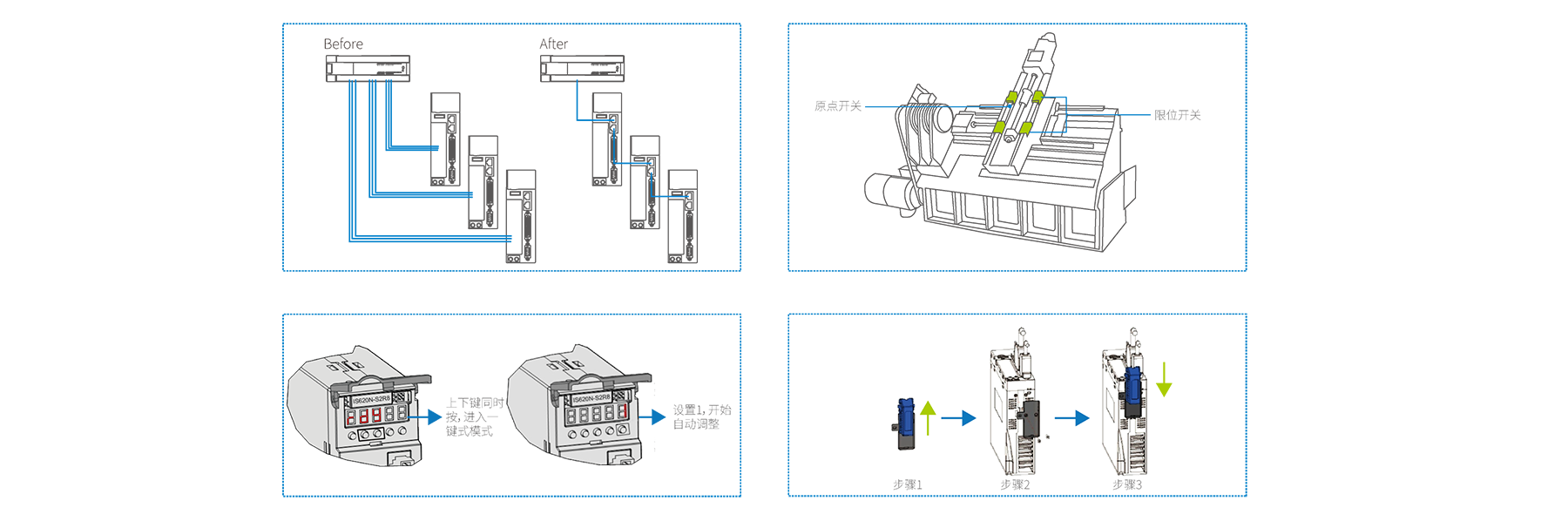 配線(xiàn)方便簡(jiǎn)單;省去限位與原點(diǎn);一鍵式調整;絕對值編碼器電池更換方便可靠